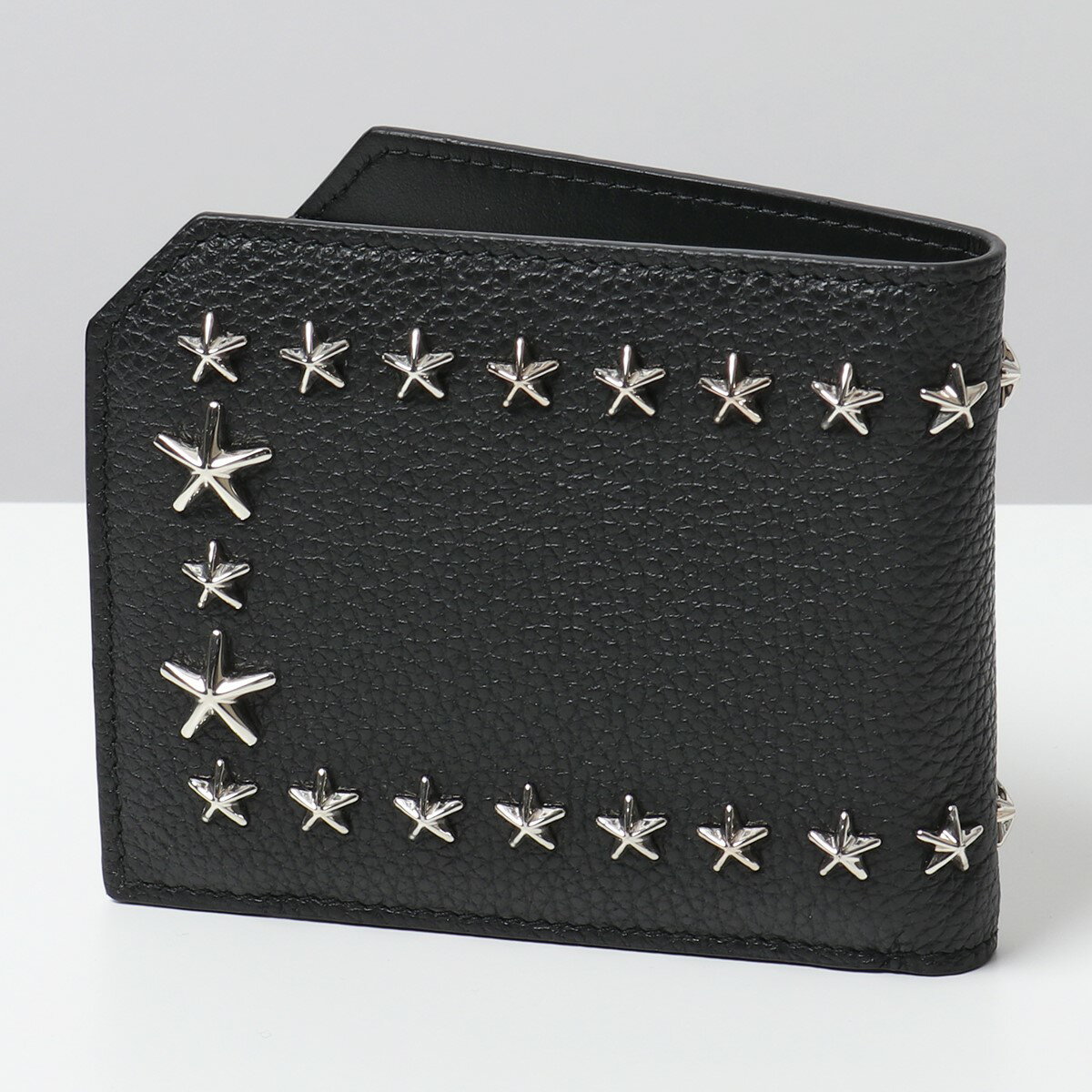 シボ加工が施された柔らかなレザーにスタースタッズが装飾された二つ折り財布。
